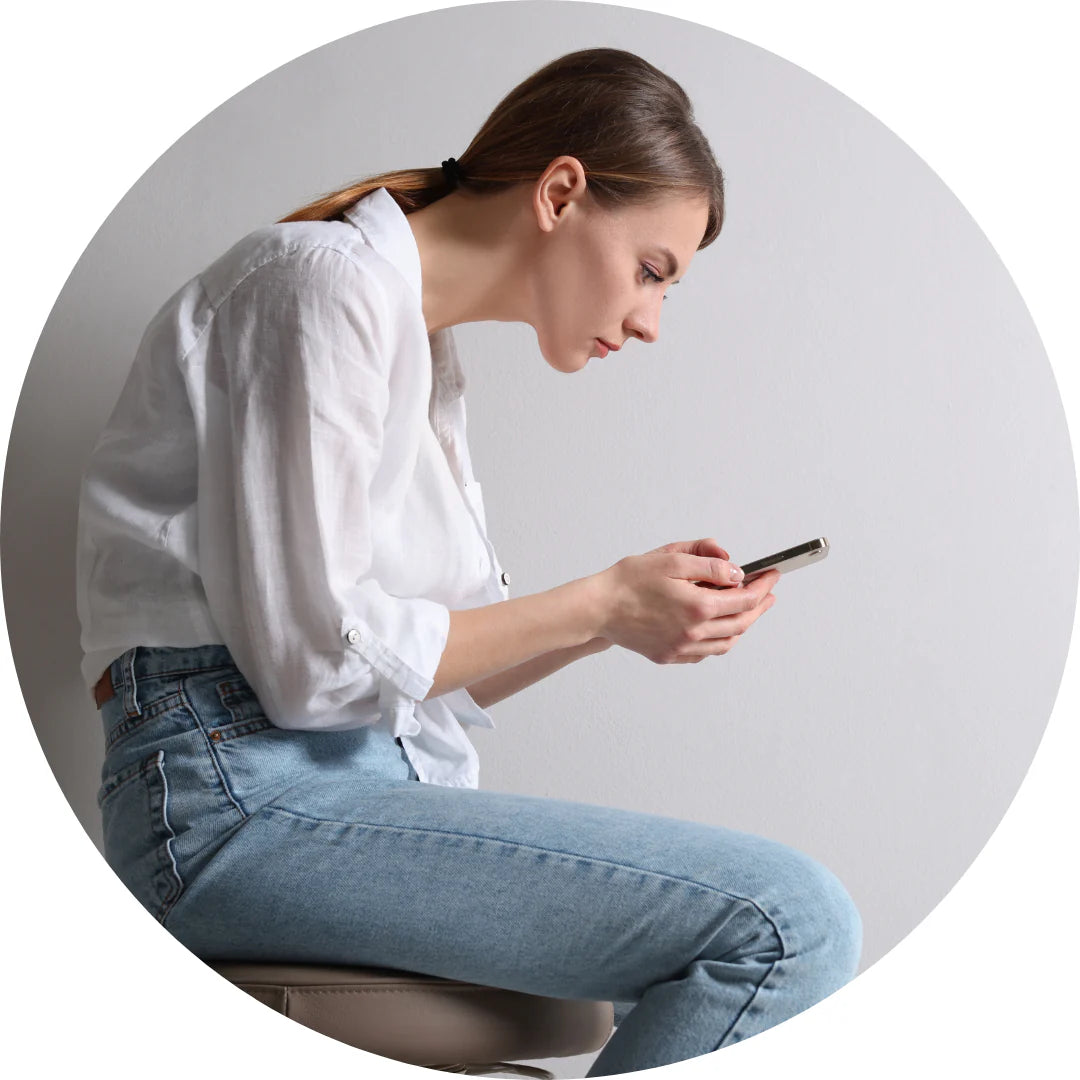 Valandos sėdėjimo, pasilenkus prie ekrano.